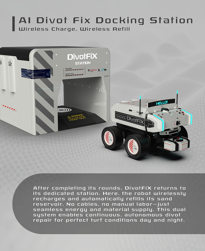 DivotFiX는 골프장 전역의 디봇을 사람의 개입 없이 보수하도록 설계된 자율주행 로봇입니다
