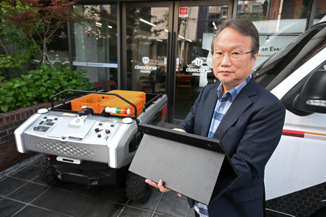 여준구 대동로보틱스 대표가 22일 서울 서초구에 위치한 사무실에서 다목적운반로봇 RT100을 점검하고 있다. (조태형 기자)