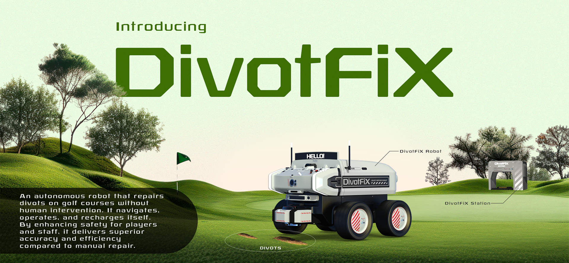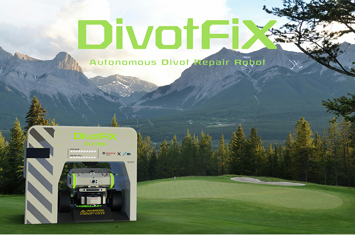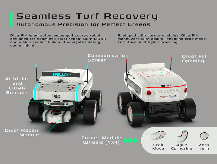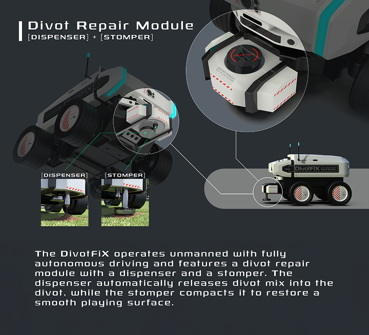 DivotFiX는 골프장 전역의 디봇을 사람의 개입 없이 보수하도록 설계된 자율주행 로봇입니다
